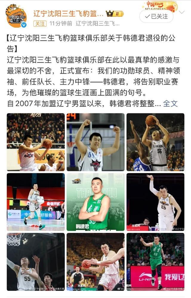 9月1日,辽宁篮球队对外宣布队长韩德君结束自己的职业生涯。辽宁队方面表示,韩德君将自己的18年的热血与青春都毫无保留地奉献给了这支球队。韩德君在1日接受北京青年报记者采访时表示,自己接下来没有什么具体计划,就是先休息休息。