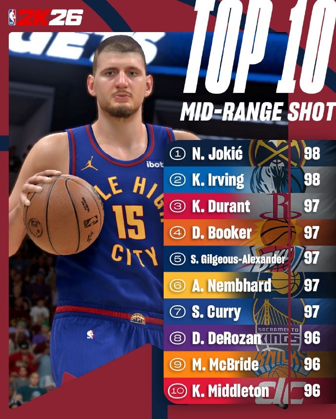 在这次的评分当中,尼科拉-约基奇和凯里-欧文的中距离均为98分,而凯文-杜兰特的中距离为97分。此外,尼克斯球员迈尔斯-麦克布莱德的中距离为96分。