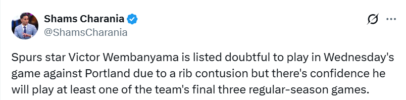 名记麦克马洪表示:“说实话,文班亚马很看重各项个人奖项,这对他和球队都是重要目标。他只需要再打一场比赛、且出场至少20分钟,就能满足评奖资格。如果他最终没做到,我会非常震惊。他会达成65 场常规赛最低出场要求的。而且球队现在还有一点缓冲空间,因为他打过NBA杯决赛,那场是计入场次的。不过话说回来,这次伤病更偏向每日观察类型。幸运的是,我认为球队不会让他带伤强行出战,但他肯定会达标满足评奖门槛。”